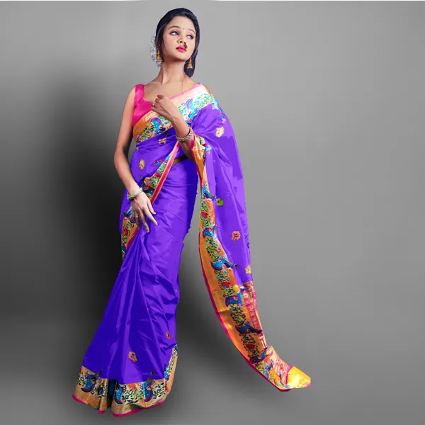 Royal Blue & Pink Semi Silk Embroidery Work Yeola Semi Paithani Saree With ..More