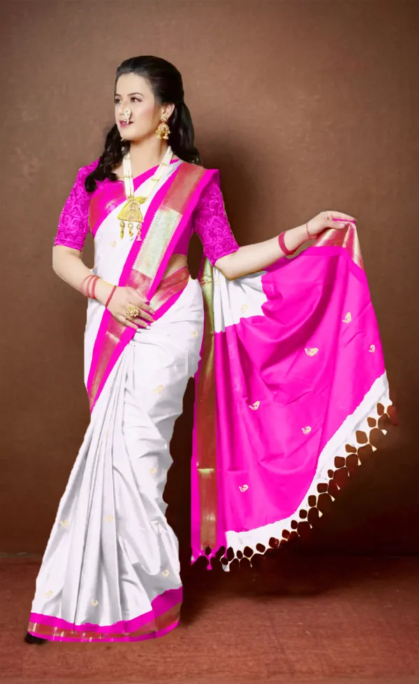 White & Pink Sico Silk Full Zari Work Semi Paithani Saree With Blouse Piece..More